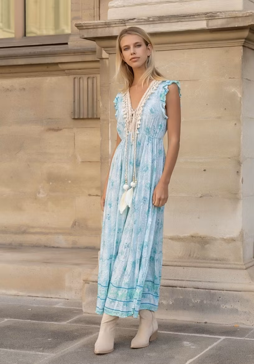 Lång turkos klänning med blommönster V-ringning med beige tofsar Kort volangärm