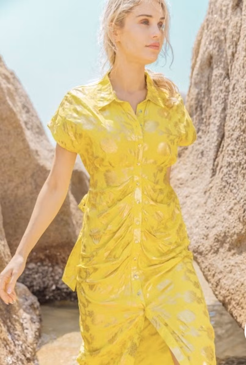 Annie I lager. 600 kr Storlek s/m m/l l/xl Lägg i korgen Gul klänning med guldtryck Krage Knappar framtill Knytband för midjan Knälång Kort ärm100% Viscose