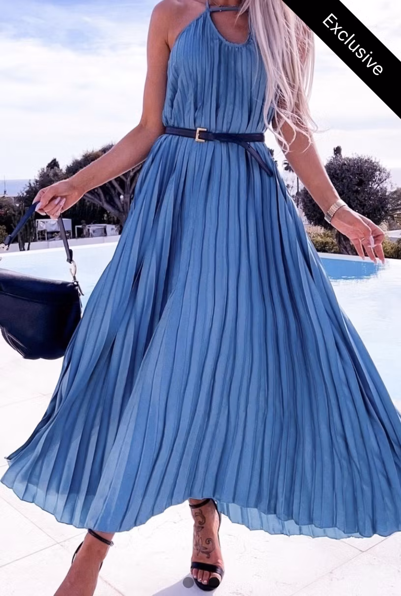 Kim blå I lager. 400 kr Storlek one size Lägg i korgen Lång plicerad blå klänning med knytning runt halsen45% Viscoes 50% Polyester 5% Elastan
