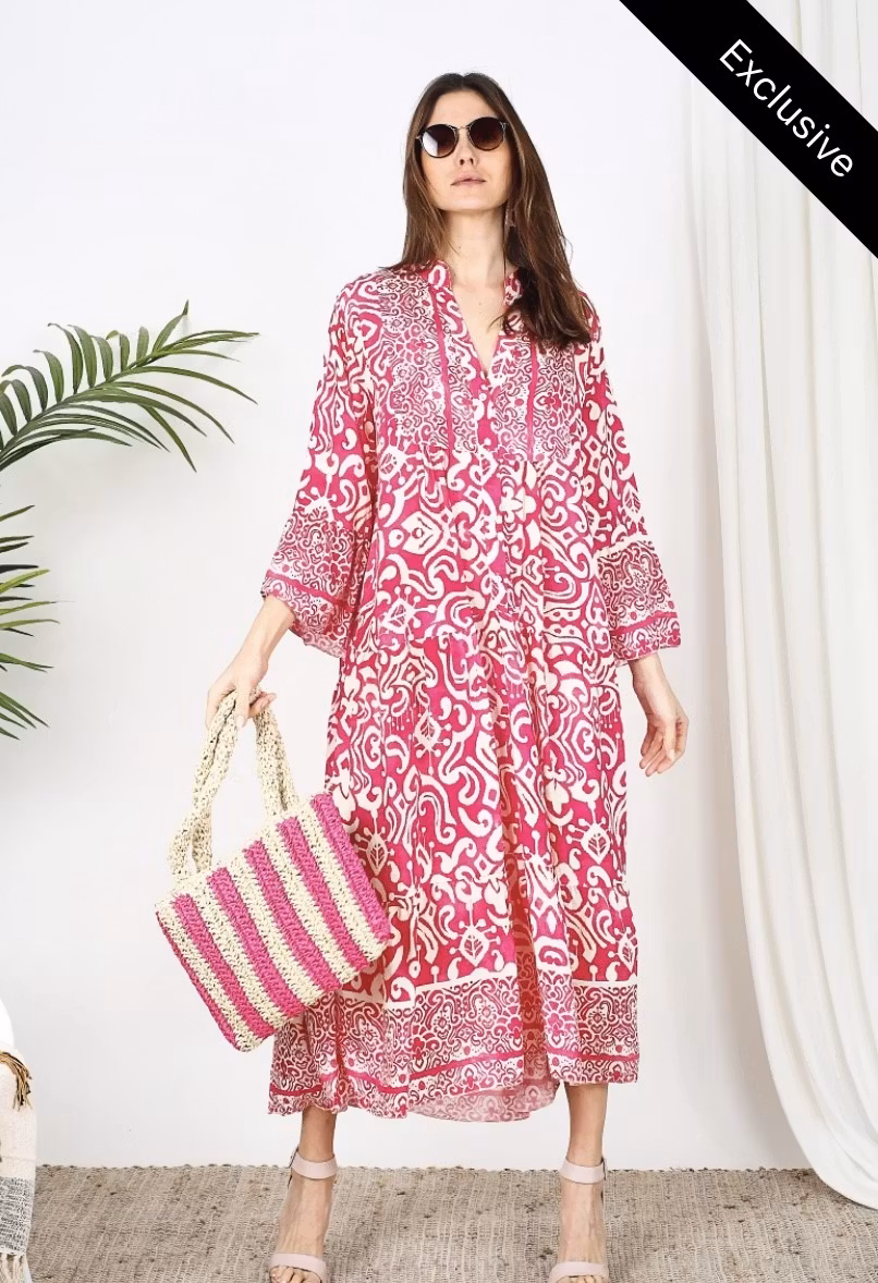 Lång klänning paisleymönstrad rosa och vit kantat med annat rosavitt tyg