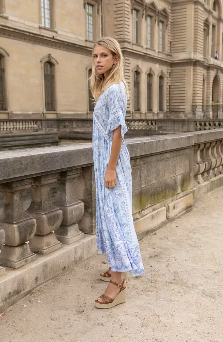 Eloise blå I lager. 600 kr Storlek s/m m/l l/xl Lägg i korgen Lång klänning ljusblå med blått och lila blommönster V-ringning Kort ärm med volangkant och snörning i ryggen100% Viscose